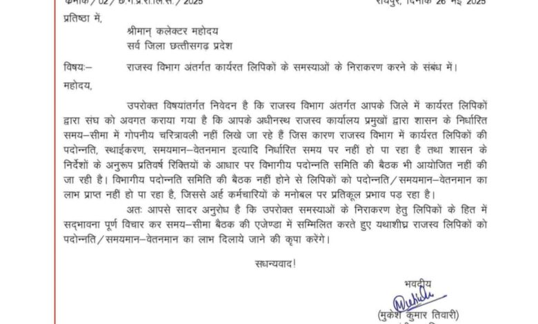 छत्तीसगढ़ राज्य के राजस्व विभाग में कार्यरत लिपिकों ने अपनी समस्याओं के निराकरण के लिए एकजुट होकर अपनी मांगें रखी हैं। लिपिकों का कहना है कि कार्यालय प्रमुखों द्वारा समय पर गोपनीय चरित्रावली नहीं लिखे जा रहे हैं, जिससे पदोन्नति, स्थाईकरण और समयमान वेतनमान में देरी हो रही है। इससे लिपिकों को न केवल आर्थिक नुकसान हो रहा है, बल्कि उनके मनोबल पर भी प्रतिकूल प्रभाव पड़ रहा है।